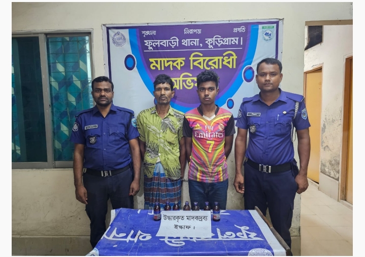 কুড়িগ্রামের ফুলবাড়ীতে ৭ বোতল ভারতীয় মাদকদ্রব্য (ফেনসিডিলের বিকল্প) এস্কাফসহ পিতা পুত্রকে গ্রেফতার করেছে ফুলবাড়ী থানা পুলিশ।